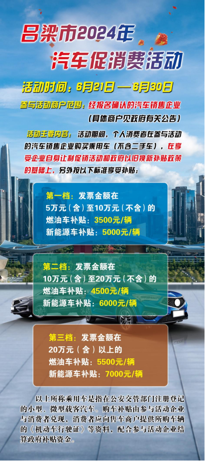 发布会上,市商务局相关负责人解读了吕梁市汽车以旧换新相关政策,公布了6月21至6月30日在全市开展2024年汽车促消费活动。全市51户汽车销售企业参与本次活动,参与活动商户范围为经报名确认的汽车销售企业(具体商户见政府有关公告)。活动期间,个人消费者在参与活动的汽车销售企业购买乘用车(不含二手车),在享受企业自身让利促销活动和政府以旧换新补贴政策的基础上,还享受三档补贴:第一档为发票金额在5万元(含)至10万元(不含)的燃油车补贴3500元/辆、新能源车补贴5000元/辆;第二档为发票金额在10万元(含)至20万元(不含)的燃油车补贴4500元/辆、新能源车补贴6000元/辆;第三档为发票金额在20万元(含)以上的燃油车补贴5500元/辆、新能源车补贴7000元/辆。以上所称乘用车是指在公安交管部门注册登记的小型、微型载客汽车。购车补贴由参与活动企业与消费者兑现,消费者应向售车商户提供所购车辆的《机动车行驶证》等资料,配合参与活动企业结算政府补贴资金。