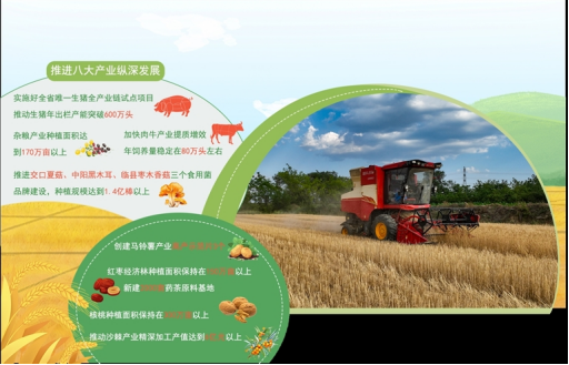 推进八大产业纵深发展。加快临县、兴县、岚县、交口、石楼、中阳、方山七个基地县建设,实施好全省唯一生猪全产业链试点项目,推动生猪年出栏产能突破600万头。推进文水、方山、交口、柳林等基地县建设,加快肉牛产业提质增效,年饲养量稳定在80万头左右。推进交口夏菇、中阳黑木耳、临县枣木香菇三个食用菌品牌建设,种植规模达到1.4亿棒以上。推广杂粮产业生物降解膜、膜下滴灌等单产提升技术,种植面积达到170万亩以上。创建马铃薯产业高产示范片3个,支持岚县1000万粒微型薯生产,产量达到50万吨以上。推进红枣经济林提质增效,种植面积保持在150万亩以上,新建2000亩药茶原料基地。加快核桃优良品种改良,种植面积保持在300万亩以上。持续推动沙棘产业精深加工,精深加工产值达到6亿元以上。