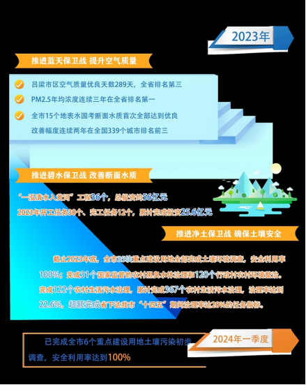 2023年,吕梁市区空气质量优良天数289天,全省排名第三;PM2.5年均浓度连续三年在全省排名第一;全市15个地表水国考断面水质首次全部达到优良,改善幅度连续两年在全国339个城市排名前三。