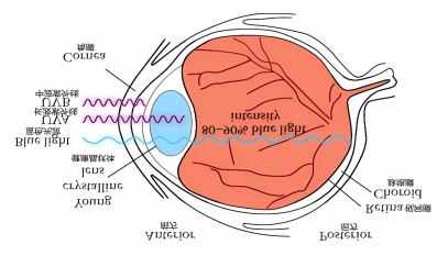 当阳光照射到眼睛时,首先会接触到角膜,其次是晶状体,最后才到达视网膜。前二者就像眼睛的保护罩,一方面尽量吸收紫外线,免得视网膜出现问题;另一方面允许可见光波(如蓝色光波)通过,以形成正常的视觉。