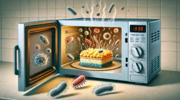 微波炉的主要工作原理是利用微波(通常是 2.45 GHz 的电磁波)使食品中的水分子振动。这种振动导致分子之间的摩擦,从而产生热量。当微波照射食物时,食物内部的水分子会迅速吸收能量并开始振动,导致温度上升。而高温是杀死微生物的主要机制。当温度达到微生物的耐受极限(通常在 60°C 以上),蛋白质和其他重要的生物分子会变性,导致微生物死亡。
