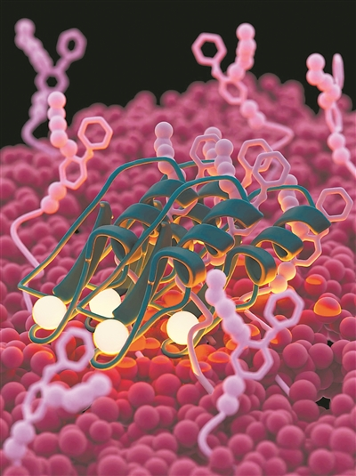 简单来说,这种小分子抗生素能够组装成较大的结构,锁定在细菌细胞表面,就像魔术贴两侧钩环密合粘在一起那样,使细菌无法逃脱,从而无法继续感染身体细胞。