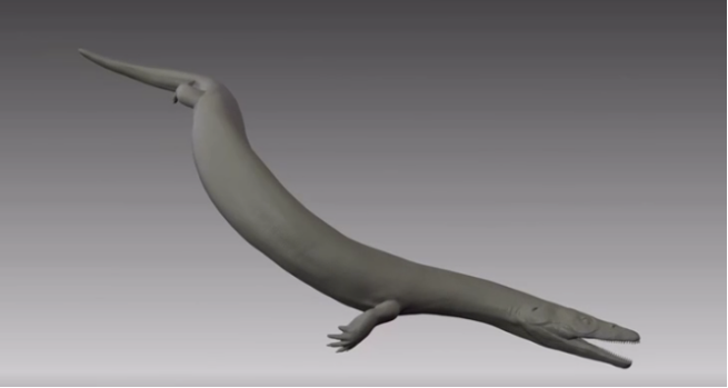 这条龙的头非常尖,身形修长,它的背椎将近有30枚,而四肢很细弱、很短。这样的身形有什么好处呢?它可以在海里面自由地扭动身体,像鳗鱼一样灵活地游泳。这就是最早从陆地返回海洋里面的这批龙所展现出来的样子。