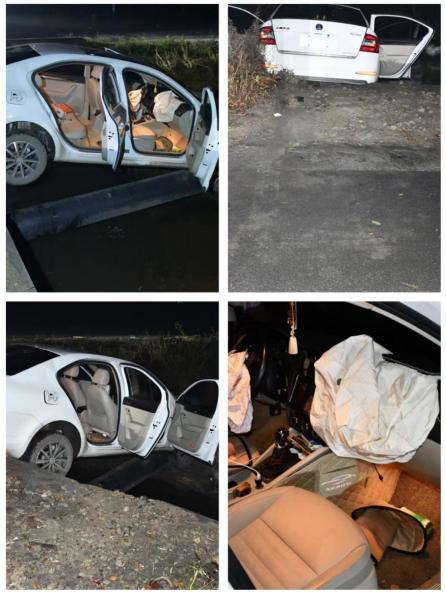 案例2:2024年11月14日,田某驾驶晋J牌白色小轿车在汾阳市冀村镇九枝社从东向西行驶时,由于雨天路滑,田某操作不当,车辆侧滑掉入路旁树林。幸运的是,因车内人员均规范使用了安全带,驾驶人及三名乘客并未受伤。
