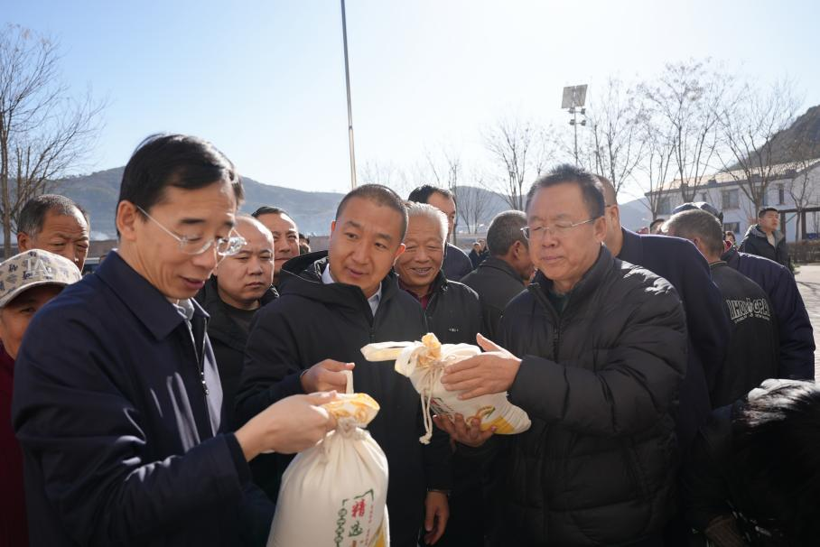 吕梁经开区在临县三交镇兴隆湾社区开展“爱心消费 助力帮扶”活动中,吕梁经开区管委会副主任刘挨照与三交镇党委书记李振强、镇长高宁交流农产品销售情况