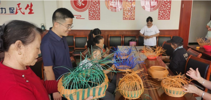 省派临县工作队大队长陈锴一行在湫水柏林苑社区视察社区居民手工编织篮子