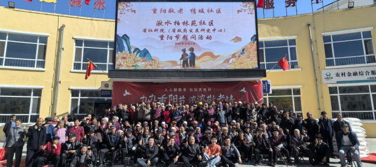 省社科院(省政府发展研究中心)驻湫水柏林苑社区工作队与社区居民共庆重阳节并为 70 岁以上老人每人发放一袋面粉合影