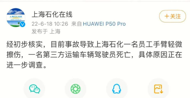 6月18日4时28分,上海市金山区一石化公司突发火情。目前,火势已得到控制。据@上海石化在线 消息,经初步核实,目前事故导致上海石化一名员工手臂轻微擦伤,一名第三方运输车辆驾驶员死亡,具体原因正在进一步调查。 天还没亮,家住金山的宋强(化名)被爆炸声惊醒,远处的火光让他有一丝恍惚,再一翻看手机,微信群里邻居、朋友已然炸开了锅。“我听到了两次爆炸,第一次4点10分左右,第二次4点20分左右,相隔7公里的地方,依然能听到呼呼呼的燃烧声音,比马路上汽车压着路面的唰唰声还要刺耳”,宋强告诉中新网记者。 宋强的朋友也将拍到的视频发上了网,但见画面中浓烟翻滚。另有在上海石化公司的员工反映,已经接到紧急返岗通知。 应急管理部派出由消防救援局负责同志带领的专家工作组赶赴现场协助指导处置。上海石化化工部乙二醇装置发生火情区域现场。