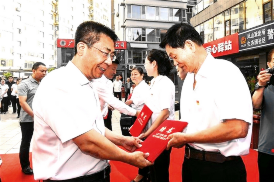 图为市委书记孙大军为“银发网格员”颁发聘书。 记者 王益炜 摄