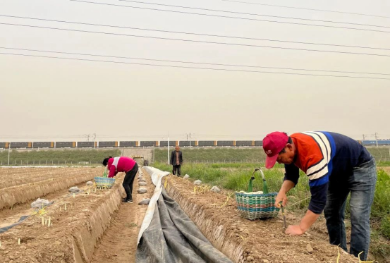 村民在万荣县裴庄镇田间采收芦笋。