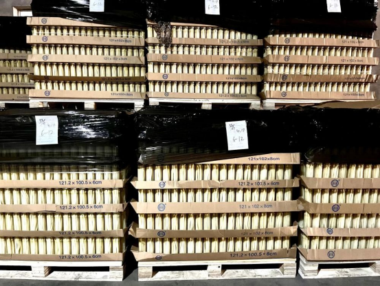 装罐完成等待出口的芦笋罐头。