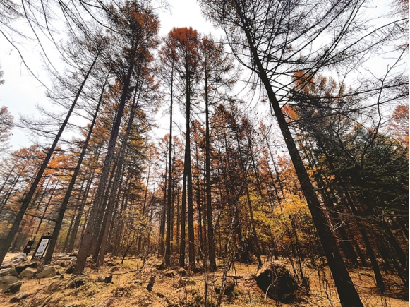 走进针叶林、阔叶林交汇的八道沟,满眼是葱郁挺立的树木,除了生长着常见的针、阔混交林外,还生长着大片的辽东栎。抬头望去,百树争高,树叶沙沙。斑驳的树皮裹覆着青苔,清脆的流水声夹杂着空灵的几声鸟语,仿佛置身世外桃源。