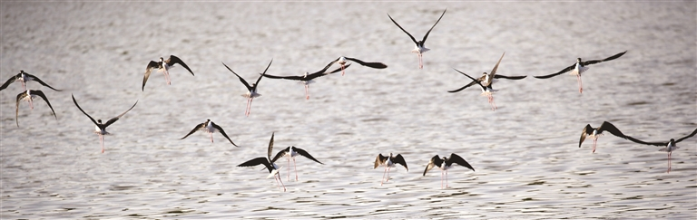 近年来,随着汾河生态环境的不断优化,吸引了众多动物来此栖息落脚。近日,文水汾河又迎来了一群群的黑颈长脚鹬,它们在河水中嬉戏、觅食,并在这里繁衍后代。黑颈长脚鹬是一种修长的黑白色涉禽,体长约37厘米。嘴为黑色细长,两翼黑色,长长的腿为红色,体羽白,颈背有黑色斑块,栖息于河流浅滩、草地中的湖泊、浅水塘和沼泽地带。常常成对或成小群在浅水中或沼泽地上活动,主要以软体动物、虾、甲壳类、环节动物、昆虫、昆虫幼虫以及小鱼和蝌蚪等动物性食物为食。每年春天它们就会飞来,在汾河浅滩处筑窝,繁殖期为5-7月,每窝产卵一般为4枚。