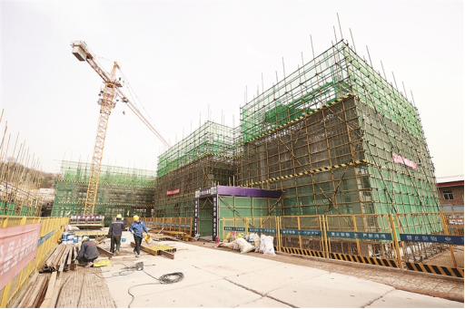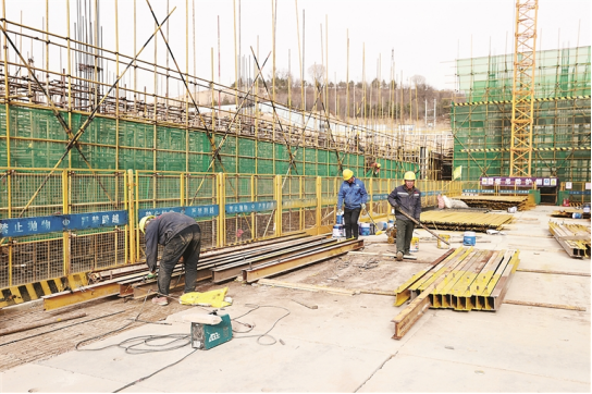 图为吕梁市第二小学项目工地工人师傅正在加班加点,在保证质量的前提下紧张施工。