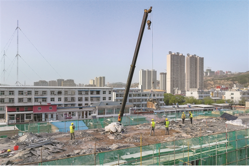 图为吕梁建投施工人员对市农行营业部家属楼进行楼顶改造。