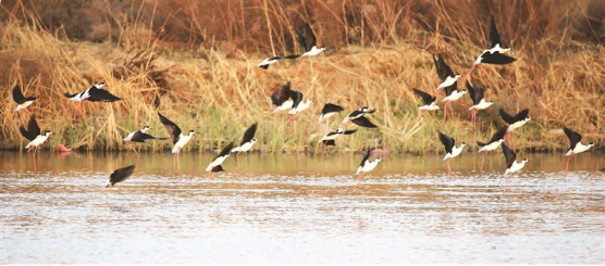 黑颈长脚鹬是一种修长的黑白色涉禽,细长的嘴和两翼均为黑色,长长的腿红色,体羽是白色,颈背具黑色斑块,一般栖息于开阔平原草地中的湖泊、浅水塘和沼泽地带。黑颈长脚鹬每年4月初迁来北方繁殖地,9月后离开北方繁殖地往南迁徙。最近,文水汾河出现了一群群的黑颈长脚鹬,他们在这里休养生息,繁殖后代。