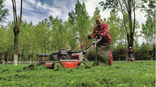 近日,市区北川河公园里园林工人正在驾驶着割草机修整草坪。