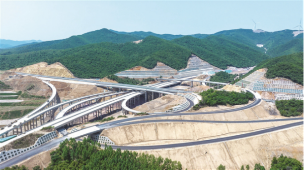 近日,在汾石高速交口段LJ4分部项目工地,记者看到交口枢纽主体工程已基本竣工,条条公路宛如巨龙在绿树成荫的山谷间来回穿梭,相互交叉,蔚为壮观;路面工地上,人头攒动、机器轰鸣,工人们正在争分夺秒、抢抓工期铺设水稳,项目建设如火如荼。